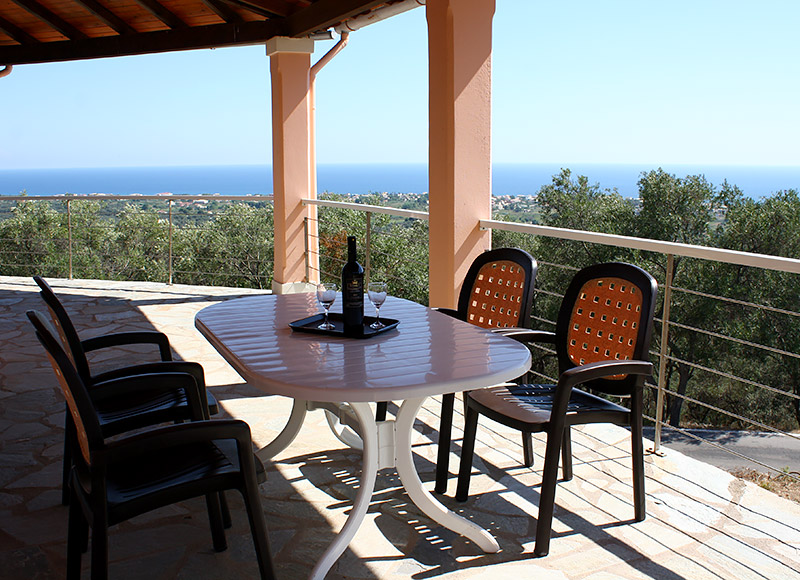 Das sehr großzügige Haus liegt im Sünde der Insel auf halbem Weg zwischen Agios Georgios, Argirades und dem traditionellen Bergdorf Hlomos. Hier haben Sie einen traumhaften Panoramablick über den See, das Meer und die Südinsel.